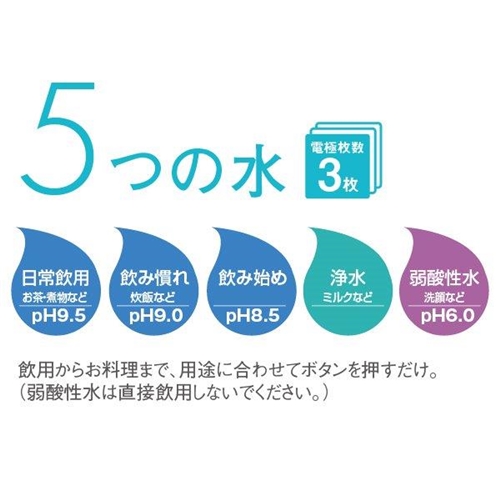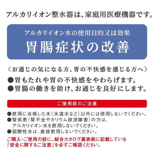 付属品名称:水切換レバー,固定具セット,吸盤・取付板(本体固定用),吐水パイプ(長さ40cm),吸盤(排水ホース用),ホース固定バンド(給水ホース用),pH試験液,グリセロリン酸カルシウム製剤(6g入×1袋)