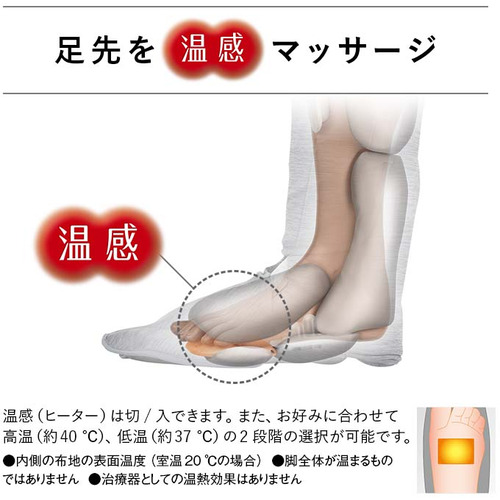 温度(ヒーター)部の表面温度(室温20℃の場合):アタッチメント内側布地表面温度 低:約37℃ 高:約40℃