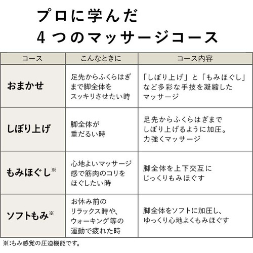 自動コース:おまかせ、しぼり上げ、もみほぐし、ソフトもみ