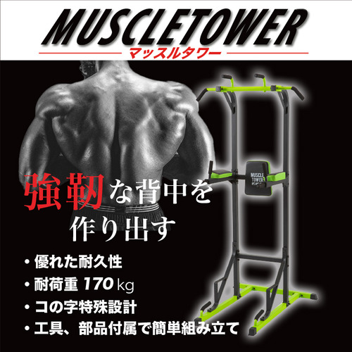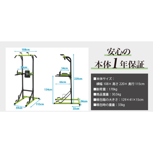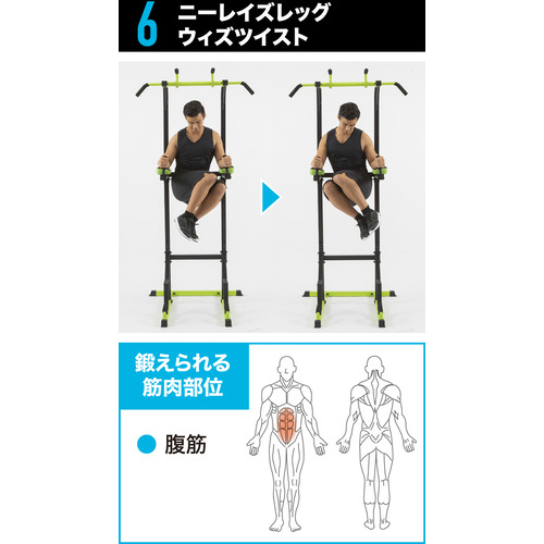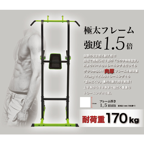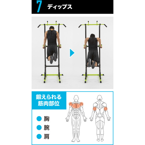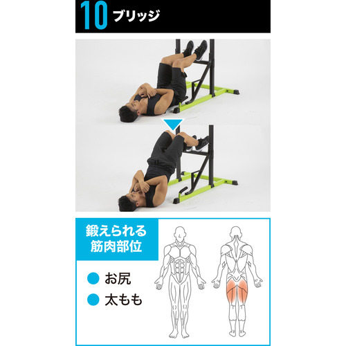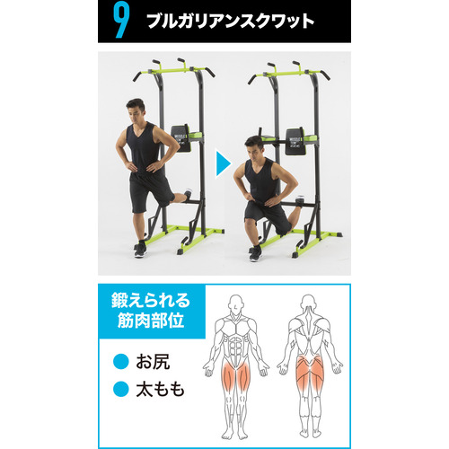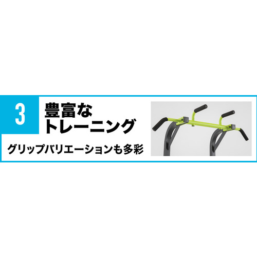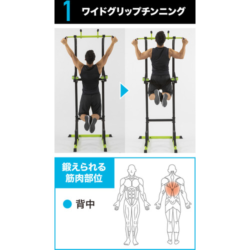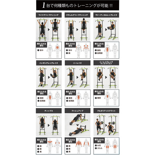 チンニング(懸垂)・ワイドグリップチンニング・パラレルグリップチンニング・レッグレイズ・ニーレイズ・ディップス・プッシュアップ・ブルガリアンスクワット・ブリッジなど、上半身から下半身まで幅広いトレーニングが可能。