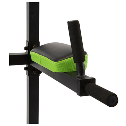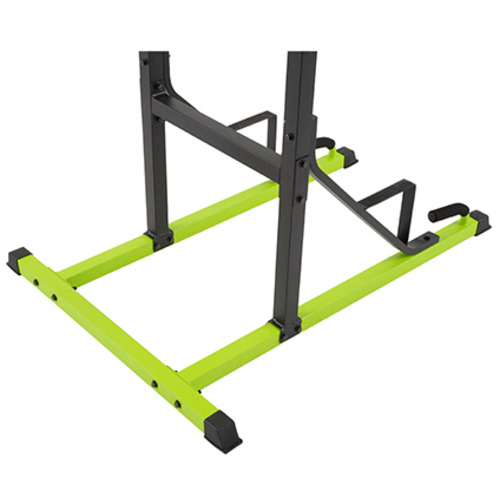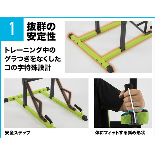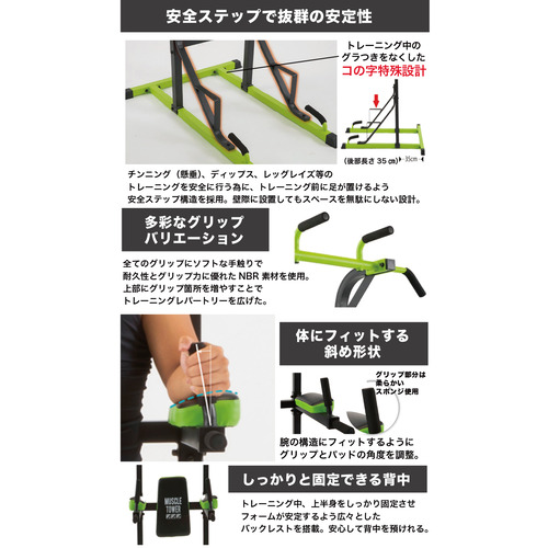 チンニング(懸垂)、ディップス、レッグレイズ等のトレーニングを安全に行う為に、トレーニング前に足が置けるよう安全ステップ構造を採用。壁際に設置してもスペースを無駄にしない設計。(後部長さ35cm)