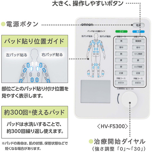 付属品:患部集中パッド(1組2枚入)×2、導子コード2本、専用ACアダプタ、パッドホルダー2個、取り扱い説明書
