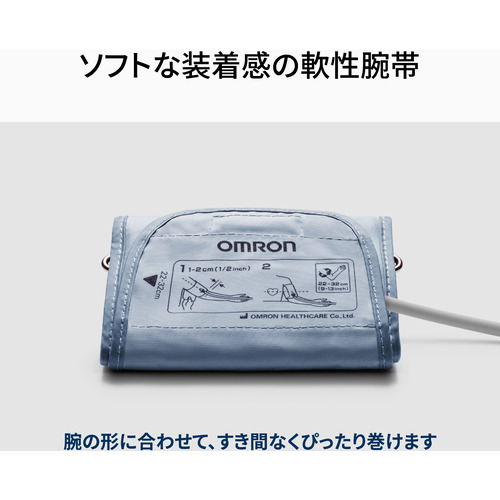 腕の形に合わせて、すき間なくぴったり巻ける軟性腕帯。ソフトな装着感で測定できます。