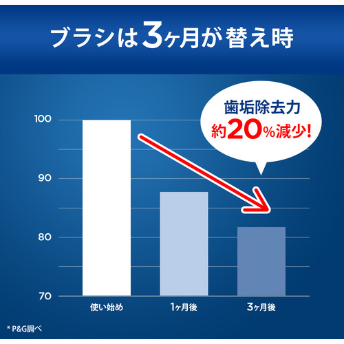 替えブラシは3ヵ月使用すると歯垢除去力が約20%減少*することが分かっています。