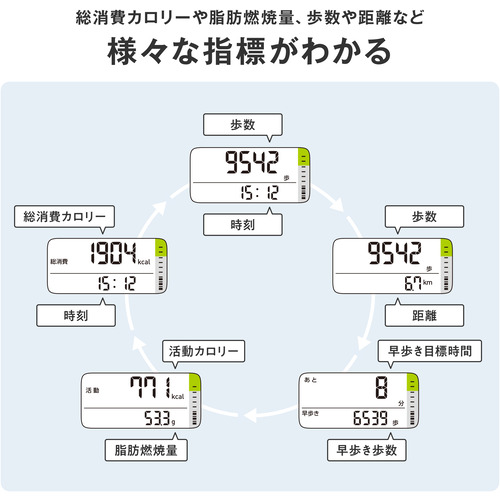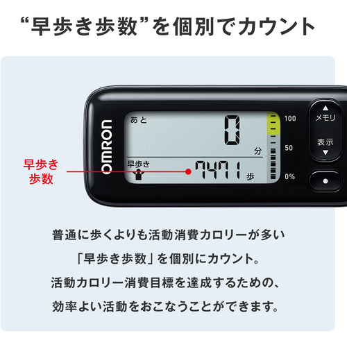 早歩き(早歩きの基準)の歩数を個別にカウントし、早歩き歩数として表示します。