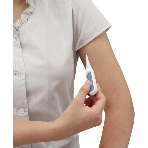 約60秒の予測検温時に1回目のブザーが3回鳴り、10分後の予測検温を表示します。そのままはさみ続けると、約10分後にブザー5回で、より正確な実測検温の終了をお知らせします。