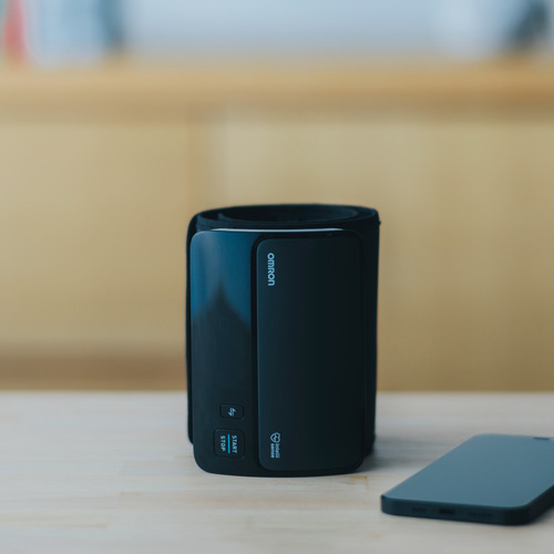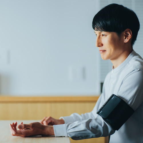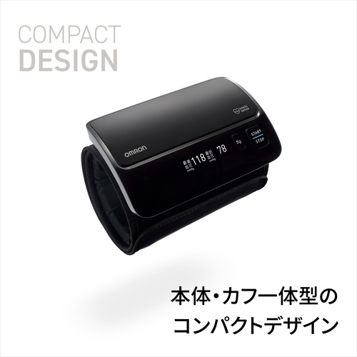 本体とカフが一体化したチューブレスタイプの上腕式血圧計。本体に腕を通して装着し、測定ボタンを押すだけで、スムーズに測定を行うことができます。カフは内部構造の改良により、腕に巻いたときに、正しい位置から左右にずれてしまっても正確に測定することができるので、装着の向きを気にせず、右腕にも左腕にも、どちらの腕にも簡単に装着することができます。また、テーブルなどに置いていても邪魔にならず、血圧が気になった時にすぐに測定することが可能です。