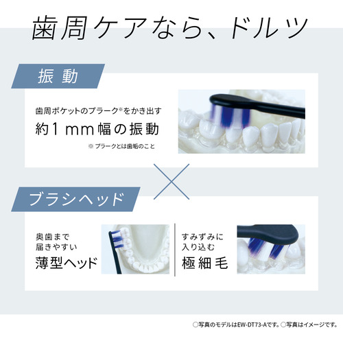 ・「歯周ポケット磨きに適した磨き方」、「押しつけすぎ」、「動かしすぎ」をライトリングが光ってお知らせ。・ドルツアプリで口内状態や好みに合わせたカスタマイズ、一人ひとりに最適なオーラルケア。・歯周ポケット磨きに適した45°に近づくように、磨き角度をアプリ画面でアシスト。