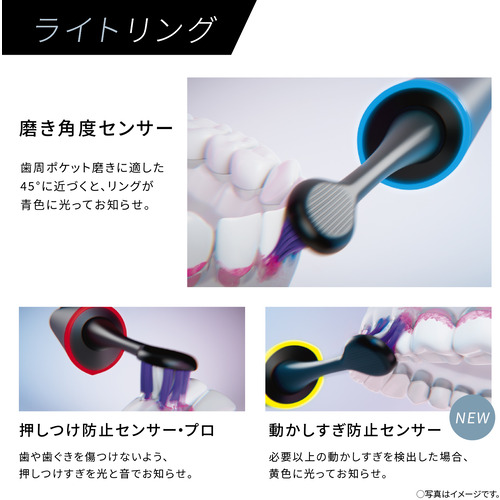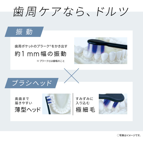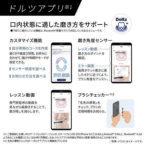 ・「歯周ポケット磨きに適した磨き方」、「押しつけすぎ」、「動かしすぎ」をライトリングが光ってお知らせ。・ドルツアプリで口内状態や好みに合わせたカスタマイズ、一人ひとりに最適なオーラルケア。・歯周ポケット磨きに適した45°に近づくように、磨き角度をアプリ画面でアシスト。