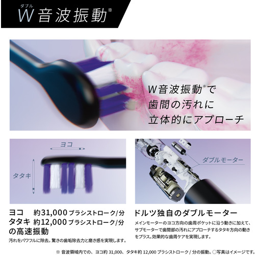 ●独自開発の強力2つのモーターが生み出す「W音波振動(※音波領域内での、ヨコ約31,000、タタキ約12,000ブラシストローク/分の振動。※)」により、約3日で歯ぐきの健康を推進(※Wクリーンまたはノーマルモードにて、トータルケアブラシ、または極細毛ブラシ(コンパクト・ラージ)を使用した場合。当社調べ。使用効果は条件により異なります。※)