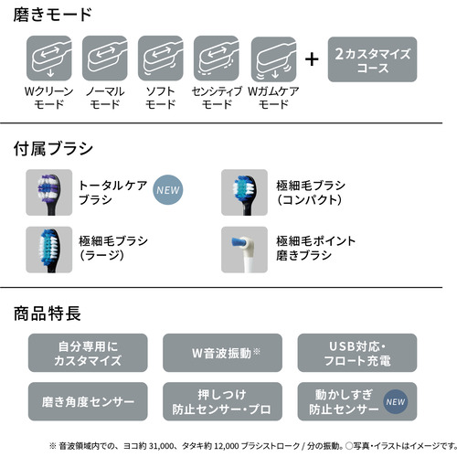 モード:Wクリーンモード、ノーマルモード、ソフトモード、センシティブモード、Wガムケアモード、カスタムモード