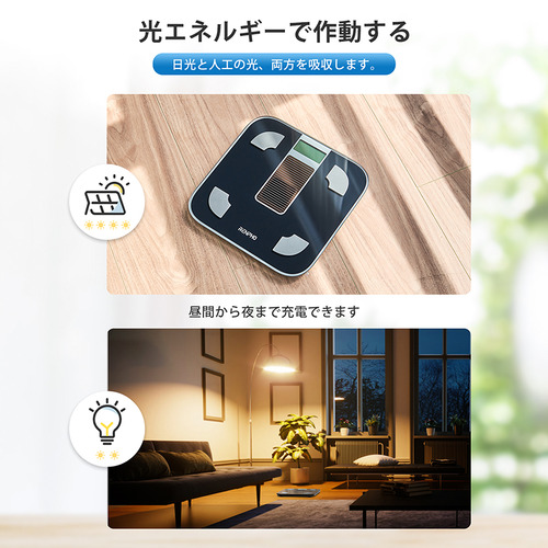 本体重計は、ソーラーパネルが搭載され、最新の光エネルギー技術を採用し、日光や人工の光で充電して作動することができます。