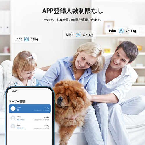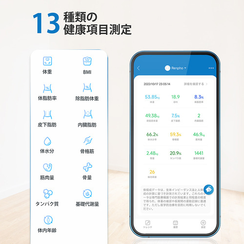 スマホで利用可能な専用アプリをご利用可能。Bluetoothでスマホに接続すれば、体重など13項目のデータ管理が可能です。