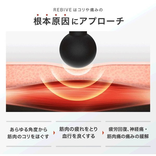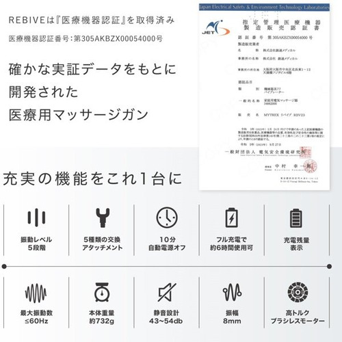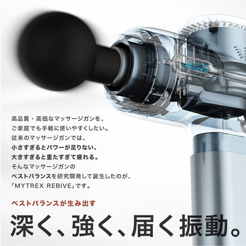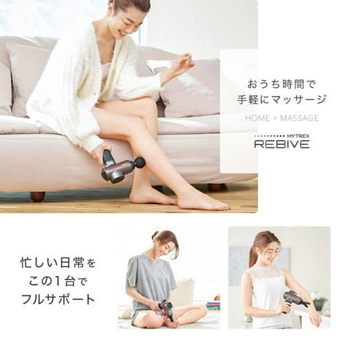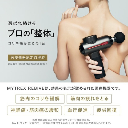 医療機器認証を取得し、リニューアルしたMYTREX REBIVE。ご家庭でも使いやすいコンパクトサイズとパワフル振動。気になる筋肉を奥深くまで刺激しコリや痛みを緩和する、新感覚のマッサージ器です。