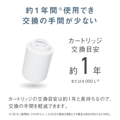 ろ材(カートリッジ)の取替(交換)時期の目安(※使用水量・水質・水圧によって大幅に短くなることがあります。※):約1年(1日10L使用時)※クロロホルム・1,2-DCE除去を目的とする場合は6か月