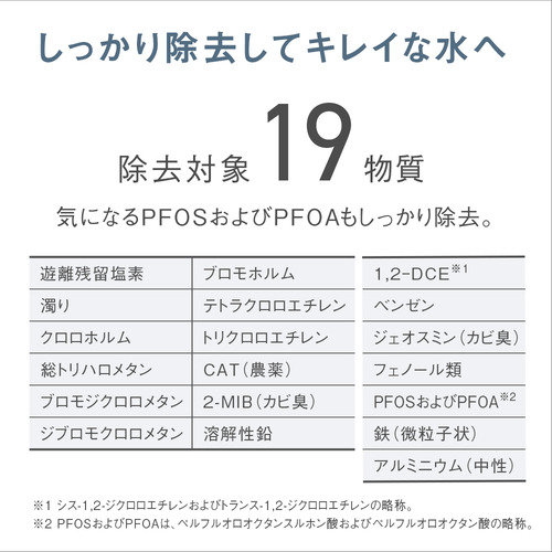 ●<高除去>気になる19物質を除去。 気になる「PFOSおよびPFOA」を含む17物質を約4000L+2物質約2000L除去可能。