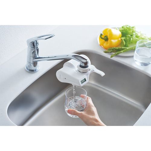 ●より使いやすく。 ・カートリッジ残量表示の液晶つきで、交換目安がわかる。 ・内ねじ用補助ねじを同梱。泡沫水栓にも対応。