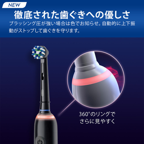 360度リングでさらに見やすくなった押し付け防止センサーがブラシ圧が強いと光ってお知らせ。過圧ストッパーが自動的に上下運動をストップ。さらに過圧コントロールがソフトな振動のモード(やわらかクリーンモード)に自動で切り替えるので歯ぐきにやさしくブラッシングできます。