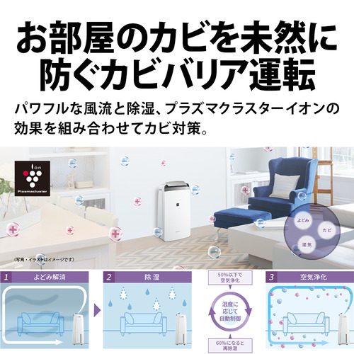 パワフルな風量と除湿、プラズマクラスターイオンの効果を組み合わせ、自動で運転をコントロールし、付着カビ菌の増殖を抑制※する[カビバリア運転]搭載。※ 約20立方メートル(約5畳相当)の試験空間での除湿運転時の7日後(1日24時間)の効果です。実使用空間での実証結果ではありません。使用場所の状況や使いかたによって効果は異なります。