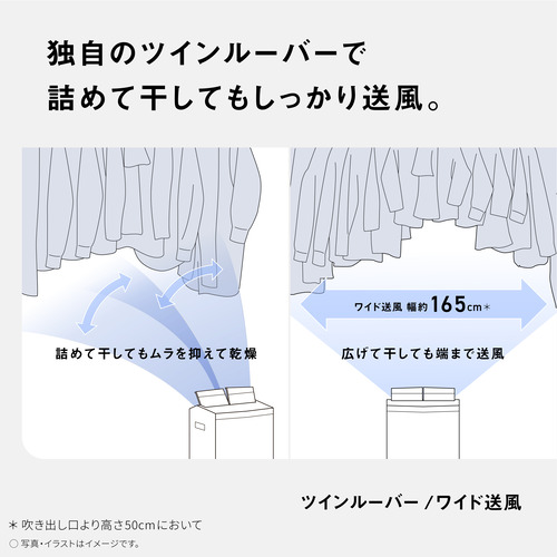 衣類乾燥:ツインルーパー 風向上下自動・風向左右自由、約165cmワイド送風(※吹き出し口から高さ50cmにおいて※)