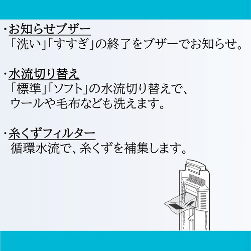 「洗い」「すすぎ」の終了をブザーでお知らせ。