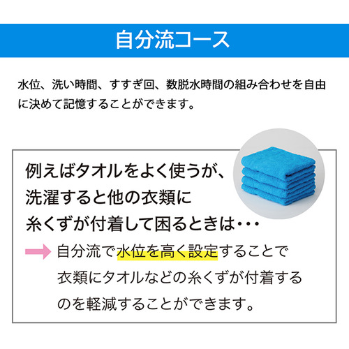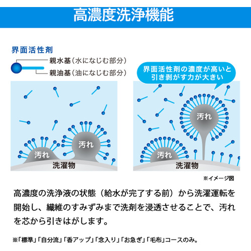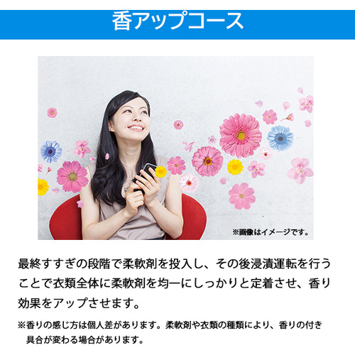 最終すすぎの段階で手動(または自動)で柔軟剤を投入し、その後浸漬運転を行うことで衣類全体に柔軟剤を均一にしっかりと定着させ、香り効果をアップさせます。