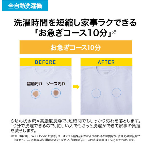 らせん状水流×高濃度洗浄で、短時間でもしっかり汚れを落とします。10分で洗濯できるので、忙しい人でもさっと洗濯ができて家事の負担を減らします。