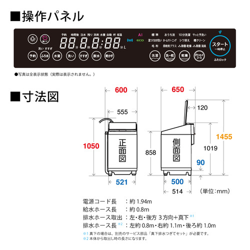 本体注釈:幅は排水ホース、高さは給水ホース含む。