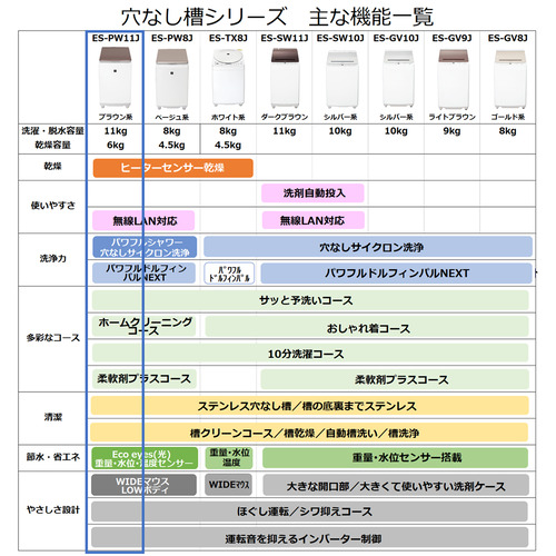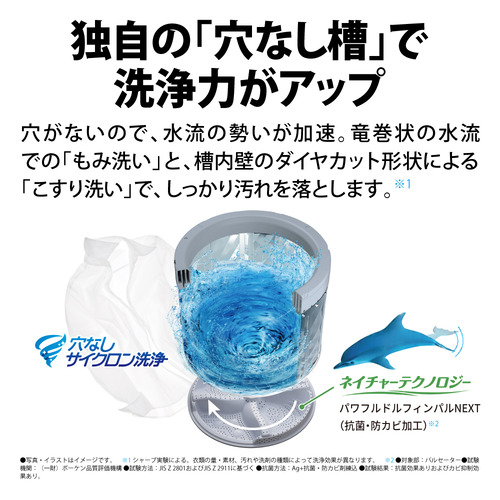 ステンレス穴なし槽なので、洗濯槽の外側や底裏についた黒カビや汚れが槽内へ侵入するのを防ぎ、清潔な水で洗い・すすぎができます。洗濯槽と外槽の間のムダ水をカットするので、節水効果も見込めます。ステンレス穴なし槽なので、洗濯槽の外側や底裏についた黒カビや汚れが槽内へ侵入するのを防ぎ、清潔な水で洗い・すすぎができます。洗濯槽と外槽の間のムダ水をカットするので、節水効果も見込めます。