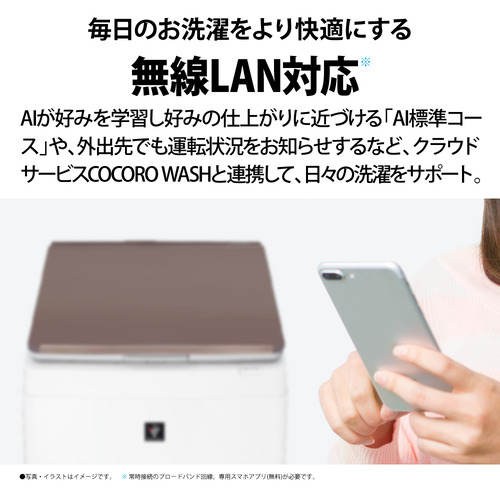 クラウドサービス「COCORO WASH」で、今日のお天気、洗い方のナビゲーション、運転状況確認、洗濯レポートの通知など、洗濯に関する様々な便利情報をお届け。さらに、「標準コース」で洗濯した後、専用アプリから洗濯物の仕上りを評価すると、AIが学習し、使うたびにお好みの仕上がりに近づくよう洗濯機が成長する「AI標準コース」を搭載しています。