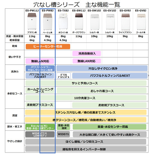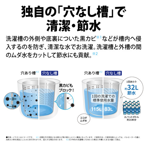 ステンレス穴なし槽なので、洗濯槽の外側や底裏についた黒カビや汚れが槽内へ侵入するのを防ぎ、清潔な水で洗い・すすぎができます。洗濯槽と外槽の間のムダ水をカットするので、節水効果も見込めます。ステンレス穴なし槽なので、洗濯槽の外側や底裏についた黒カビや汚れが槽内へ侵入するのを防ぎ、清潔な水で洗い・すすぎができます。洗濯槽と外槽の間のムダ水をカットするので、節水効果も見込めます。