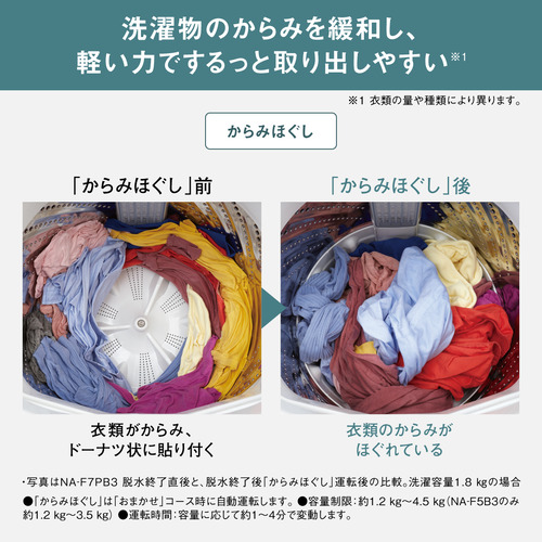 洗濯物のからみを緩和し、軽い力でするっと取り出しやすい(※衣類の量や種類により異なります。※)。 ・「からみほぐし」は「おまかせ」コース時に自動運転します。・容量制限:約1.2kg〜3.5kg ・運転時間:容量に応じて約1〜4分で変動します。