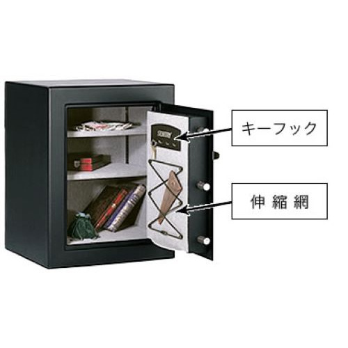 扉と本体をつなぐヒンジ部分を庫内に収納し、より高い安全性と洗練されたデザインを実現!ブラックボディにクールなシルバーフェイスが際立つクラシカルモダンなデザイン。 洗練された空間にフィットする外観は、セキュリティファニチャーとして様々なお部屋でご使用いただけます。ハイセキュリティな鋼鉄製の分厚い扉には、複数本のロッキングボルトが装備され、外部からの不正な解錠を強固にプロテクトします。さらに安全性を高めるために、付属のボルトダウンキットによる固定も可能です。