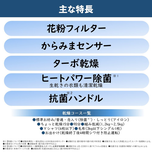 コース:標準、ちょっと乾燥15分、90分、縮み低減、Yシャツ、毛布、お出かけ