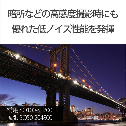 ISO感度静止画撮影時:ISO100−51200(拡張:下限ISO50、上限ISO204800)、AUTO (ISO100−12800、上限/下限設定可能)、動画撮影時:ISO100−51200相当(拡張:上限ISO102400)、AUTO(ISO100−12800相当、上限/下限設定可能)