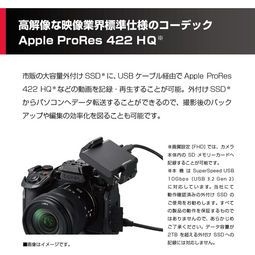 ・6K 30p 10bit/ Cinema4K 4:2:2 10bit記録などのあらゆる映像制作に対応する多彩な動画記録フォーマット ・柔軟な映像編集を可能にするV-Log撮影 と、よりハイレベルな映像制作を実現する動画RAWデータ出力 ・プロの撮影・映像制作に対応するApple ProRes 422 HQ (※画質設定[FHD]では、カメラ本体内のSDメモリーカードへ記録することが可能です。※)外部SSD記録(※本機はSuperSpeed USB 10Gbps(USB 3.2Gen2)に対応しています。当社にて動作確認済みの外付けSSDのご使用をお勧めします。すべての製品の動作を保証するものではありませんので、あらかじめご了承ください。データ容量が2TBを超える外付けSSDへの記録には対応しません。※)・カメラとスマートデバイスを使ってかんたんにライブ配信できるIPストリーミング機能(※RTMP/RTMPS規格、RTP/RTSP規格に対応する配信サイトへの配信が可能です。すべての配信サイトへの対応を保証しているわけではありません。 配信サービス側の変更によりライブストリーミング機能が使用できなくなる場合があります。詳しくは配信サービスの規約をご確認ください。※)