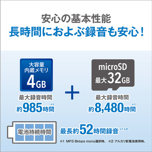 電池持続時間(録音時):アルカリ電池使用時約52時間(MP3 8kbps)
