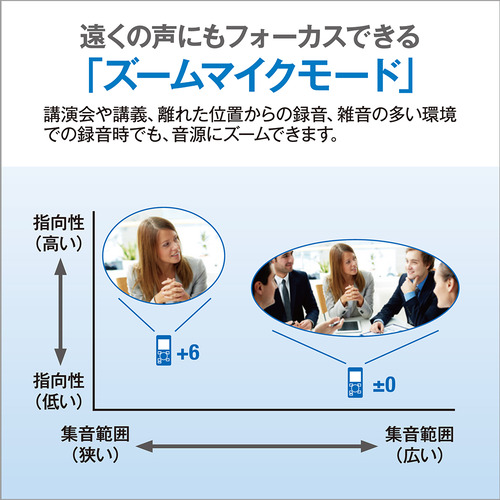 ●最新の指向性特性制御技術により、マイクの指向性を調整できる「ズームマイク」機能を備えており、離れた場所からの録音、雑音の多い環境でも、狙った音にフォーカスしてクリアに録音が行えます。