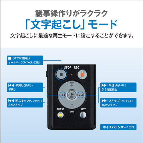 音声のない部分は自動的にスキップ、音声部分のみを再生する「声だけ再生」を搭載しています。音声がある部分のみ再生するため、録音内容を確認する時間を短縮、作業の効率化が図れます。また、聞く、止める、再度聞くという作業を繰り返す議事録などの作成に便利な「文字起こし」モードも備えています。これは再生再開時に頭切れを起こさないよう、自動的に一時停止位置の3秒前から再生されるもので、「声だけ再生」と組み合わせることで文書作成が効率的に行えます。