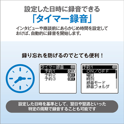 ●設定した日時で録音できる「タイマー録音」機能を搭載しています。一例として「毎週水曜」や「毎日」といった特定の周期での録音も可能です。
