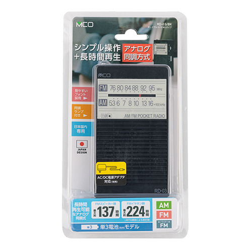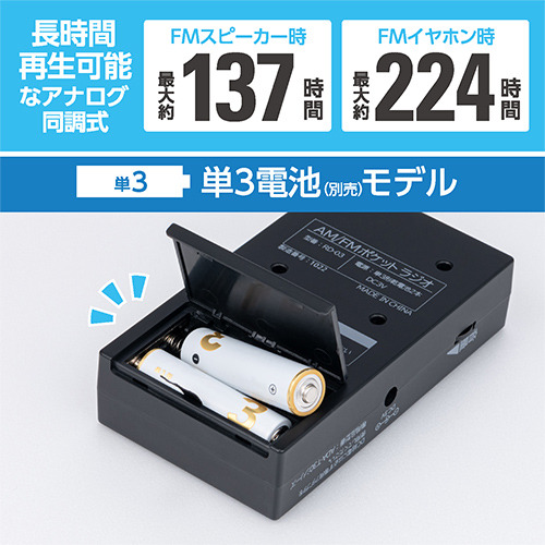 ●長時間再生可能なアナログ同調方式ラジオ。単3電池タイプ