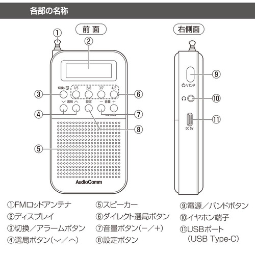 アンテナ:AM・・・フェライトバーアンテナ(内蔵)、FM・・・ロッドアンテナ