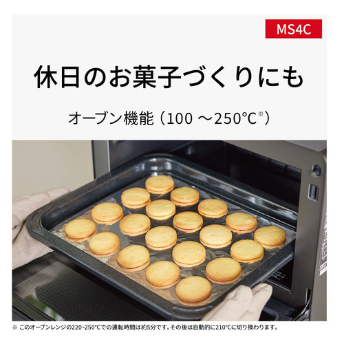 最高250℃(※このオーブンレンジの220〜250℃での運転時間は約5分です。その後は自動的に210℃に切り換わります。※)の一段オーブン。レンジ・オーブン・グリルの定番調理メニュー搭載