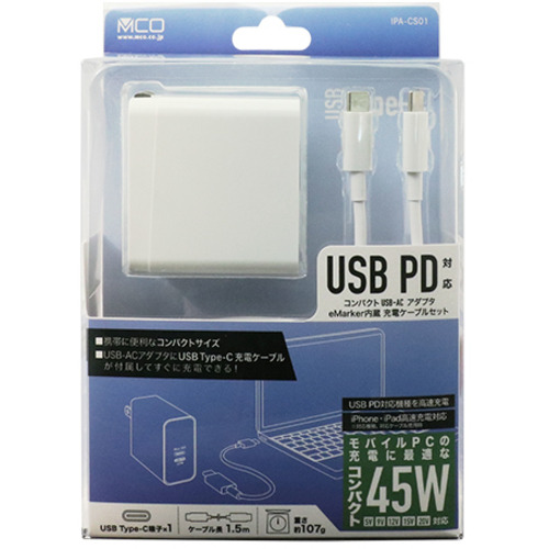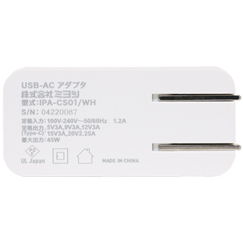ミヨシ IPA-CS01/WH USB PD対応 USB-ACアダプタ 45W TypeCケーブル付 ホワイト