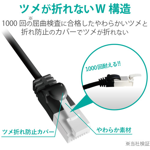 ●ツメ折れ防止プロテクタと屈曲に対する耐久性が高い新素材コネクタを採用したダブル構造で、通常の使用環境では絶対にツメが折れないLANケーブルです。