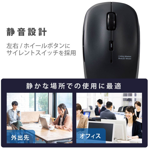 ●マウスのクリック時のカチカチ音がしない静音スイッチを採用し、音が気になる場所でも使えます。