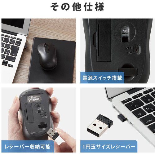 ●マウスのクリック時のカチカチ音がしない静音スイッチを採用し、音が気になる場所でも使えます。