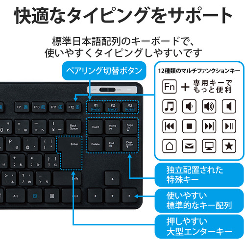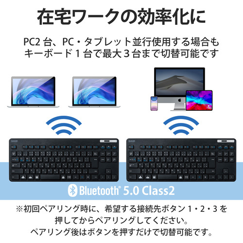 スマホ・タブレット・パソコンをマルチに接続可能な3台切替機能を搭載したBluetooth(R)5.0薄型テンキーレスキーボード。