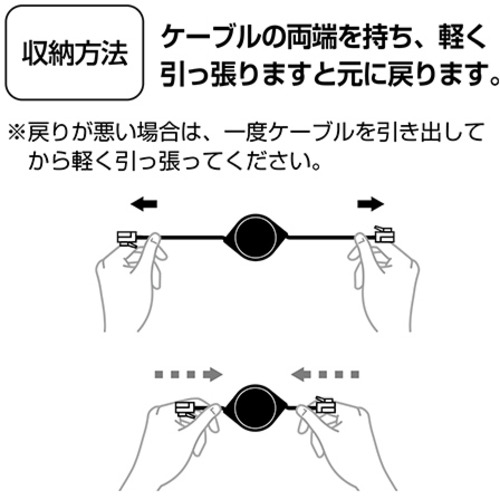 ※戻りが悪い場合は、一度ケーブルをすべて引き出してから軽く引っ張ってください。