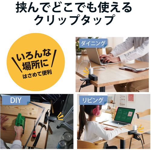 固定使用だけでなく、タップを常設できないダイニングテーブルなどでテレワークや宿題をする際に、一時的に設置して利用するのにも便利です。